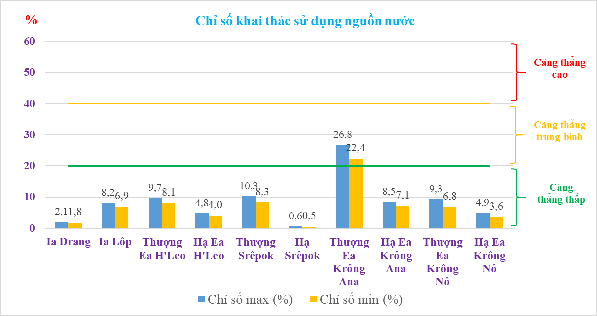 Khả năng khai thác được tính toán dựa trên nhu cầu sử dụng và lượng nước có thể khai thác sử dụng. Trong tháng 12 năm 2020, trên lưu vực sông Srê Pốk có 9 tiểu vùng thuộc chỉ số căng thẳng thấp, 01 tiểu vùng ở mức căng thẳng trung bình. Cụ thể như sau: